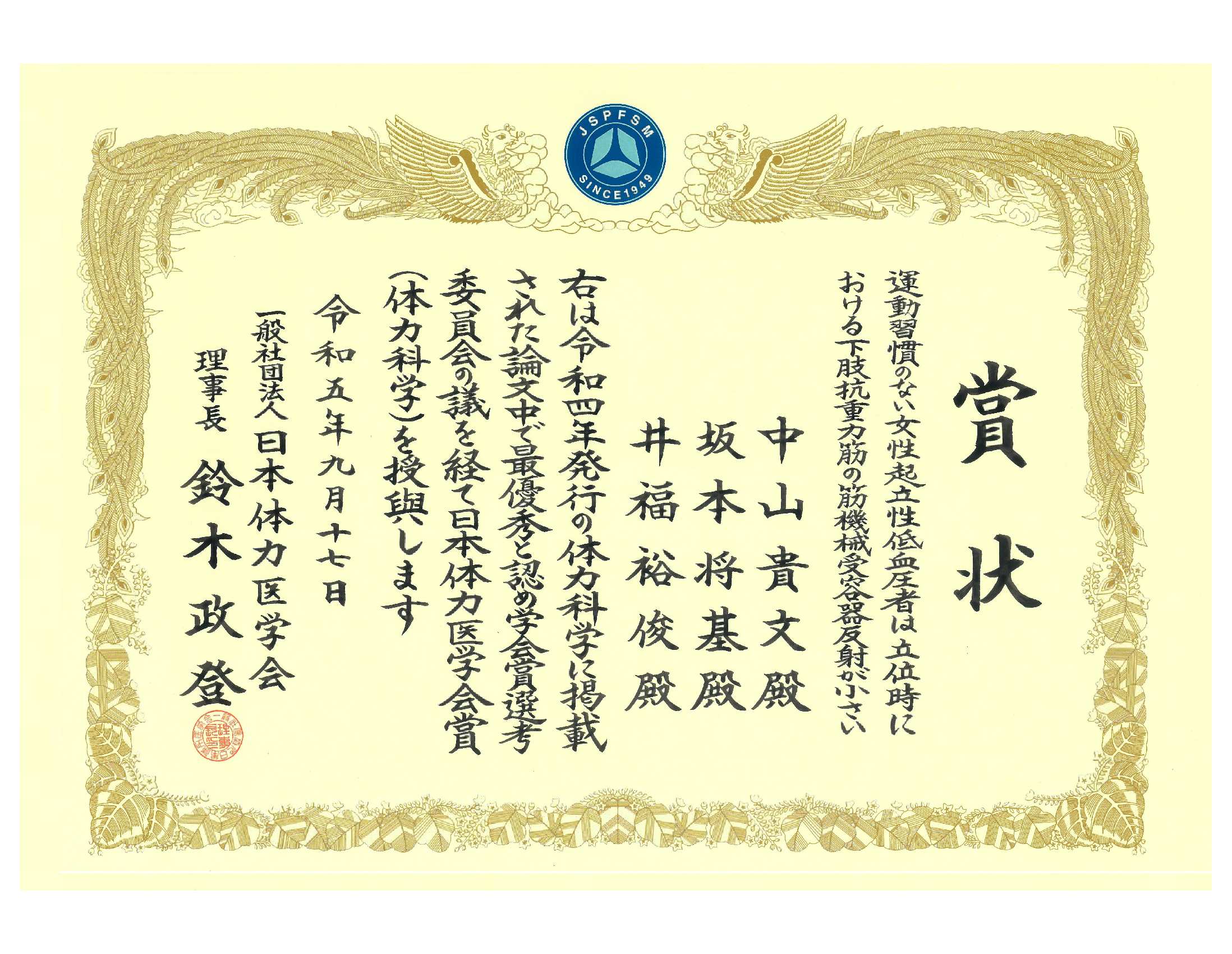 日本体力医学会受賞賞状
